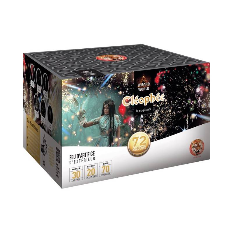 Découvrez notre article Artifices Compact Cléophée La Magicienne, une succession de tourbillons ascensionnels suivi de différents effets: scintillants blancs, pivoines colorées, étoiles crépitantes. Efffet kamuro avec filets or ou argent et retombées en cascade argentées. Jets de comètes, effets avec sifflets et final crépitant avec grosse fleur. N'attendez plus pour profiter de ce spectacle pyrotechnique qui va vous enflammer !