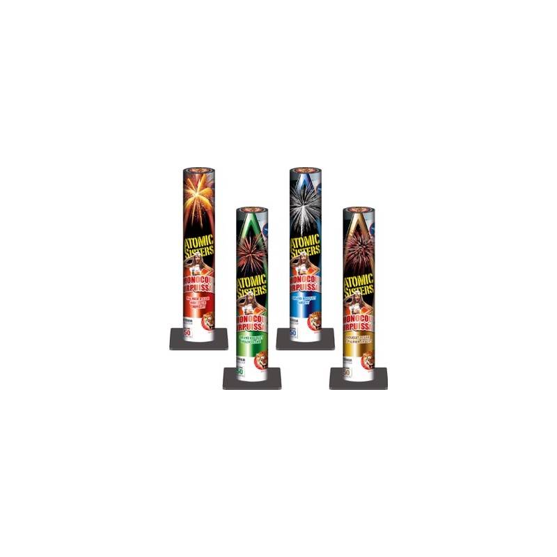 Explorez l'éclat unique des Chandelles Atomic Sister, une création exclusive offrant un ballet féerique d'étoiles multicolores ! Quatre chandelles avec chacune son bouquet (rouge&palmier argent, grand bouquet argent, grand bouquet multicolore, et palmier rouge avec coeur crépitant). Vivez une expérience pyrotechnique alliant élégance et modernité pour illuminer vos soirées de manière inoubliable. Laissez-vous emporter par la magie des étoiles!