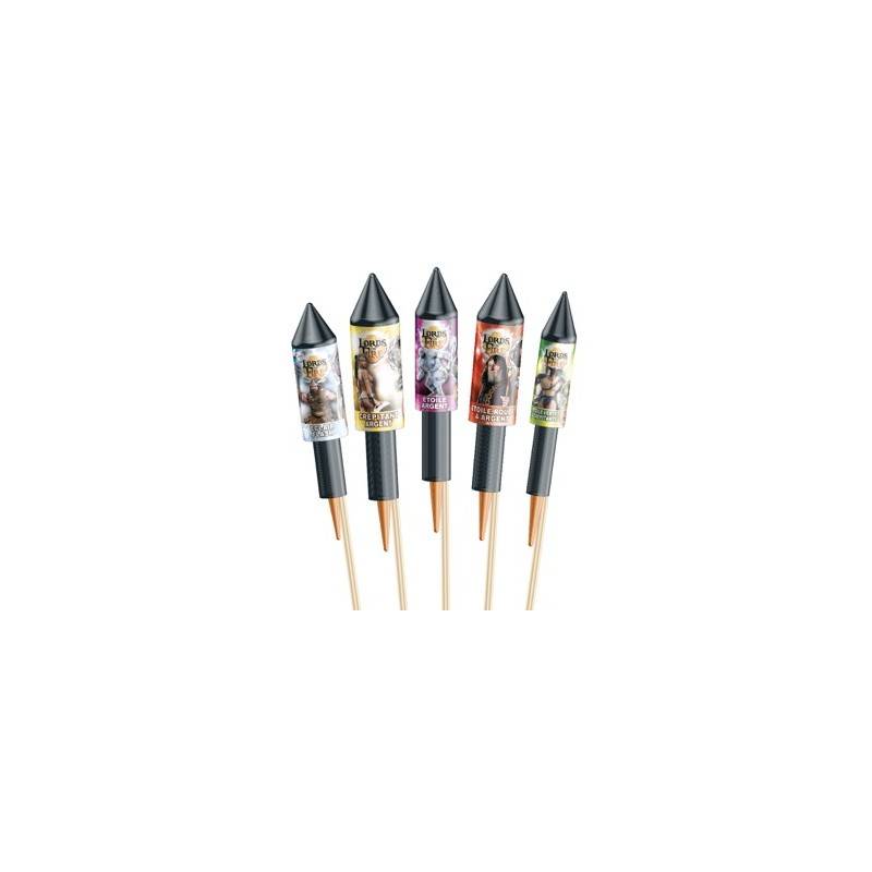 Explorez l'éclat unique des fusées Zangor Lords of Fire, une création exclusive offrant un ballet féerique d'étoiles multicolores ! 20 fusées aux effets éclatants !Trois étoiles bleues et crépitantes, trois étoiles rouges et crépitantes, deux étoiles vertes et crépitant, deux étoiles crépitants, deux étoiles jaunes et crépitantes, trois étoiles rouges et argent, trois éclairs flash, deux étoiles argent et deux étoiles argent et crépitantes. Vivez une expérience pyrotechnique alliant élégance et modernité pour illuminer vos soirées de manière inoubliable. Laissez-vous emporter par la magie des étoiles!