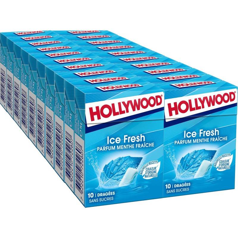 20 Étuis Hollywood 10 dragées à sensation de fraicheur. Sans Sucres et goût Ice Fresh, menthe forte. L'expérience inédite d'un chewing-gum 100% gourmand, pour une petite pause riche en plaisir dans un format pratique et multi usages.