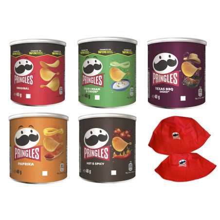 Retrouvez dans ce pack, 5 parfums de Pringles 40g, avec en bonus 2 Bobs Pringles rouges éclatants !